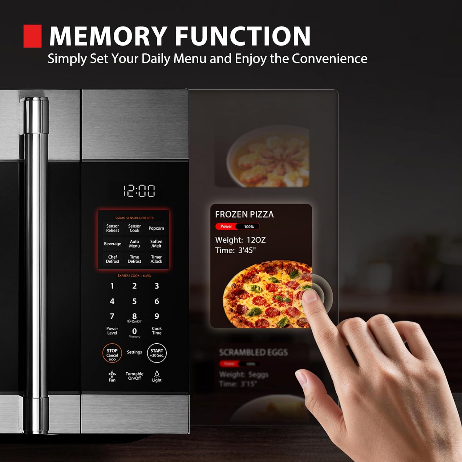 OA–EM19PH(SS) 1. Easy-to-install feature:With the patented symmetrical bridge-type flip installation and a drive-return locking mechanism. This innovation transforms the conventional installation into easy rotation installation, shortening installation time by 48%, and reducing installation tools and steps by over 25%. 2. QUIET MICROWAVE OVEN WITH SOFT CLOSE DOOR: This over the range microwave has quieter soft close door in operation, and Mute button mean less beeps and clangs 3. Equipped with a powerful 2-speed 400 CFM to keep your kitchen clear of smoke and fumes. 4. 1.9CF: This microwave oven has a 13.58 inches turntable to easily hold large plates and casserole dishes. 5. Sensor Cooking: Technology detects moisture levels and automatically adjusts cooking time for optimal results. 6. Chef Defrost Function: The sophisticated Chef Defrost not only speeds up defrosting time but also preserves the original texture and flavor of foods, offering up to 40% faster defrosting compared to traditional methods. 1000W , 11 Power levels Memory function Eco for save energy, quick + 30S